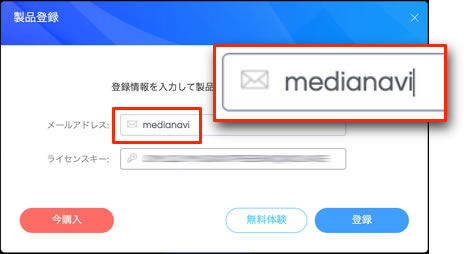 メールアドレス欄には「medianavi」(お客様のメールアドレスを入れても認証できません)、ライセンスキーの欄にはご購入時のメールに記載されているライセンスキー(64文字の英数字)を入力し、[登録]をクリックします。