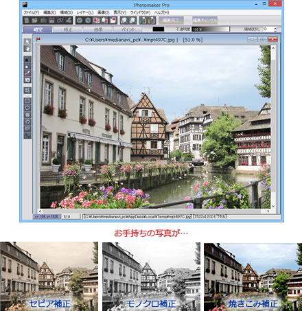 写真加工・レタッチソフト「Photomaker Pro」と連携することで、編集画面に貼り付けた写真を簡単に加工できるようになりました。