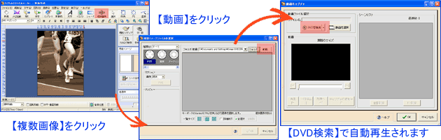 背景を設定した後、【複数画像】→【動画】とクリックし、「動画キャプチャ」を呼び出しましょう。DVDドライブにDVDをセットして【DVDを検索】をクリック。自動再生されたら、画像をキャプチャします。