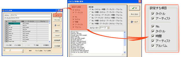 [OK]を押すと「アルバム情報の選択」画面(上図中央)が出ますので、[設定する項目]の表示チェックを必要に応じて変更します。