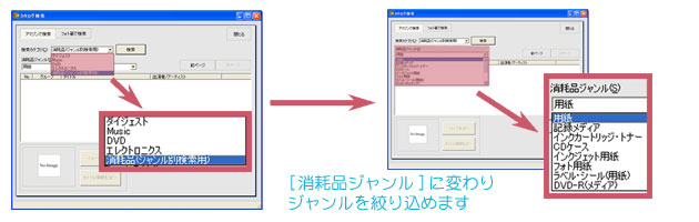 もちろん品番がわからない場合でも検索することができます。[検索カテゴリ]で[消耗品(ジャンル別検索用)]を選択すると、検索キーワードの項目が[消耗品ジャンル]に変わります。変わったプルダウンの中から、お探しの消耗品のジャンルを選択し、【検索】ボタンを押して商品を探します。