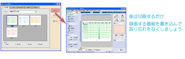 好きな色の録画予約チェック表を選んで貼り付け、印刷をすれば完成です。録画する番組を記入しておけば、もう録り忘れは恐くありません。
