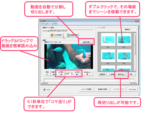 編集画面からの直接呼び出し、自動分割(8/16/32等分)、画像の再切り出し、0.1秒単位の詳細なコマ送り、などなど!機能が盛り沢山!