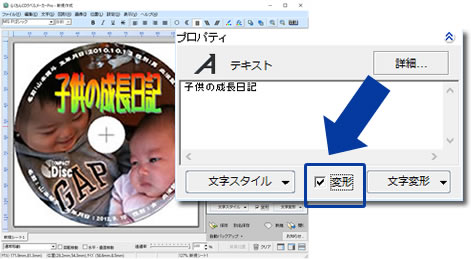 ワンクリックするだけで、文字をディスクに沿って円形にできる「文字の円形配置ボタン」を搭載 。