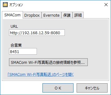 2.カメラでなんでもスキャンの設定 メニューから[ ツール(T) ] - [ オプション(O) ]を選択し、「SMACom」タブを選びます。 ![]() URLと合言葉を入力してOKを押して決定して下さい。 【SMACom Wi-Fi写真転送の接続情報を参照】 |