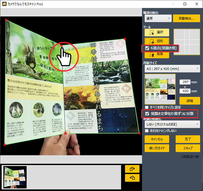 スキャン補正画面で6つの頂点をマウス操作で指定するだけで、自動で平面補正されます。